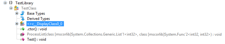 Klasa <>c__DisplayClass jest widoczna tylko w trybie IL, dlatego teraz pokażę jak wygląda ona w IlAsm, a następnie będę ją już tłumaczył na C#, dla większej przejrzystości. Będę się także odnosił do niej jako do DisplayClass, pomijając niewygodne znaki.